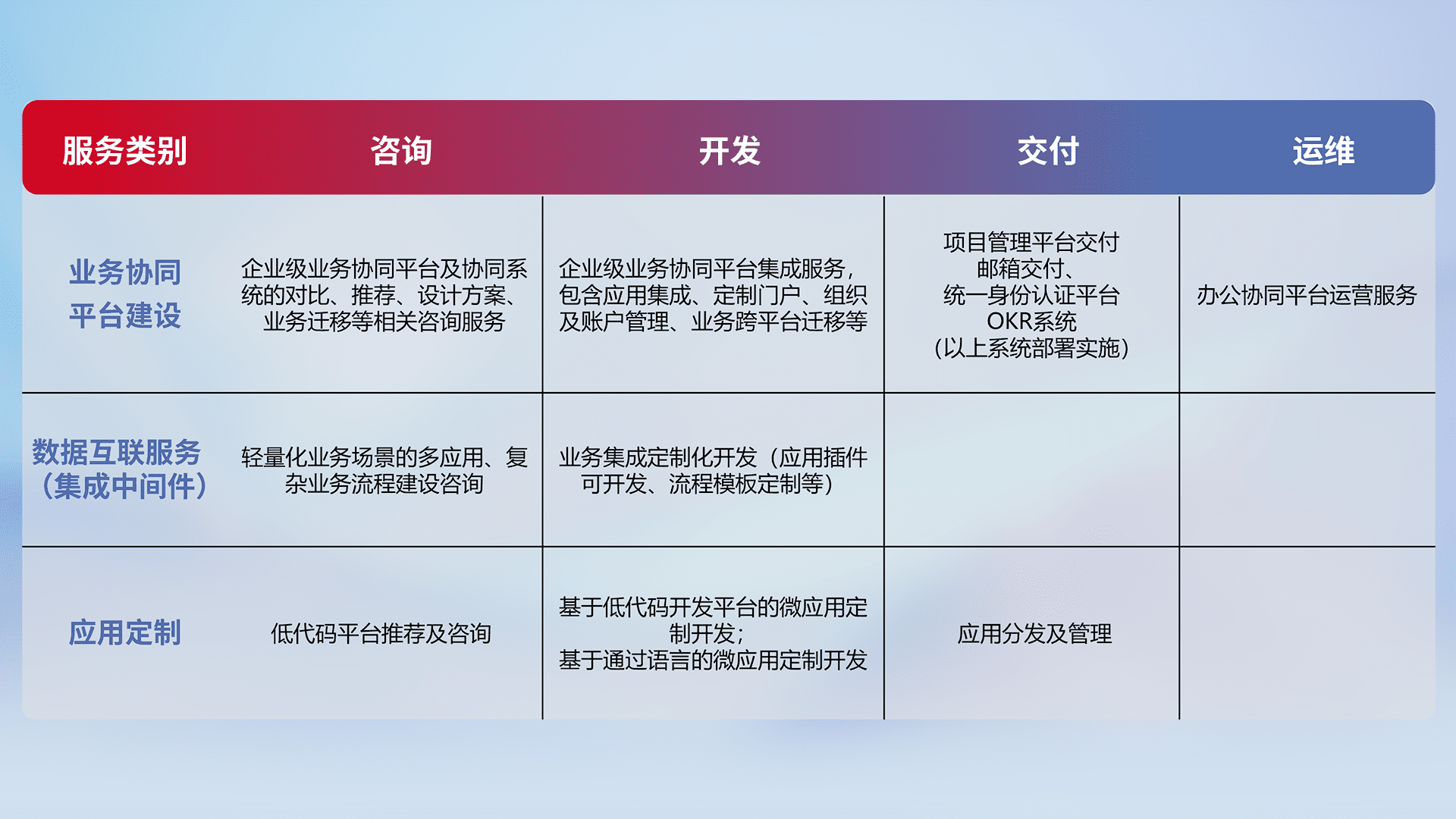 针对钉钉、、、企微、、、、IDaas等平台级产品提供产品的规划、、方案、、交付、、定制化开发等服务,,,实现如统一协同办公、、、、智能客户服务、、混合会议管理、、、智能数据查询、、、、等业务场景,,实现数字化转型。。。